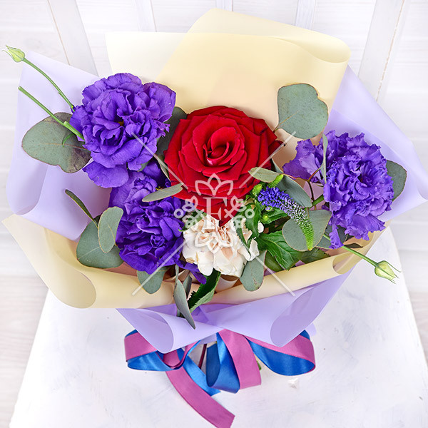 Роза красная – 1 шт., эустома фиолетовая-1 шт., гвоздика кремовая – 1 шт., декоративная зелень (вероника, эвкалипт), упаковка, лента.